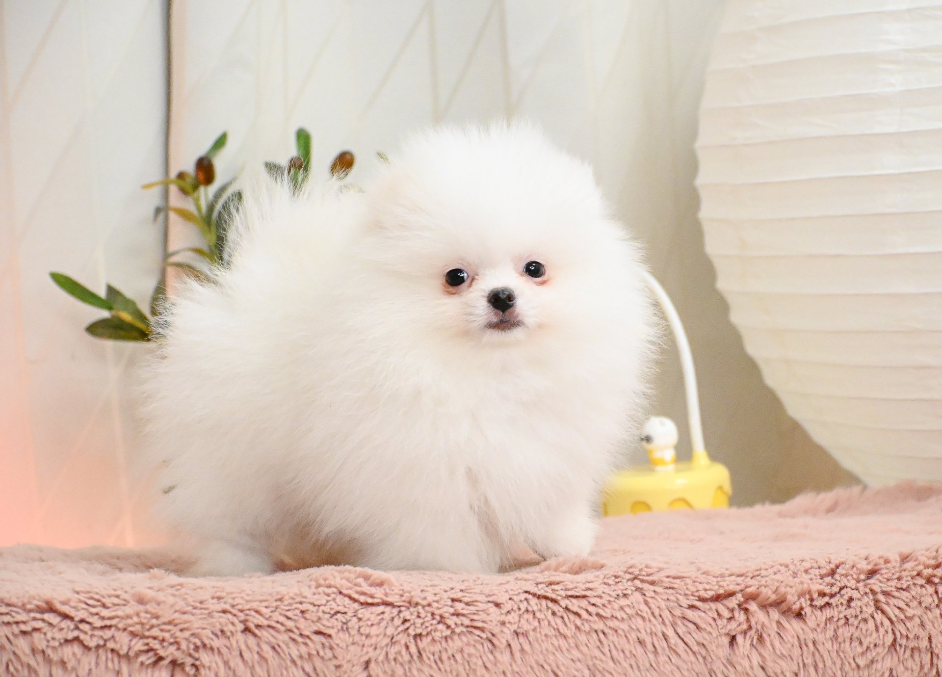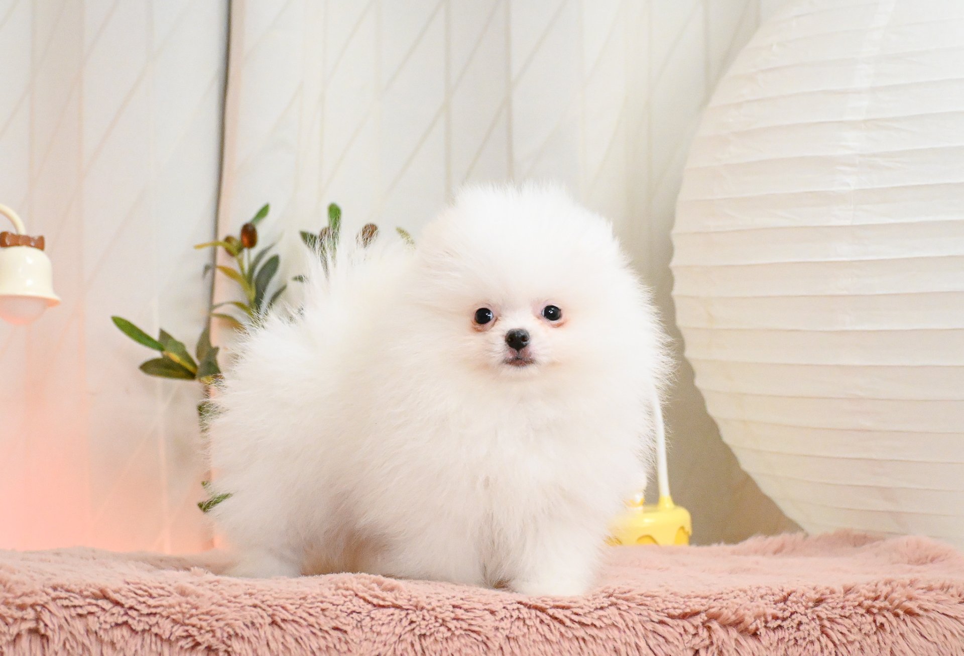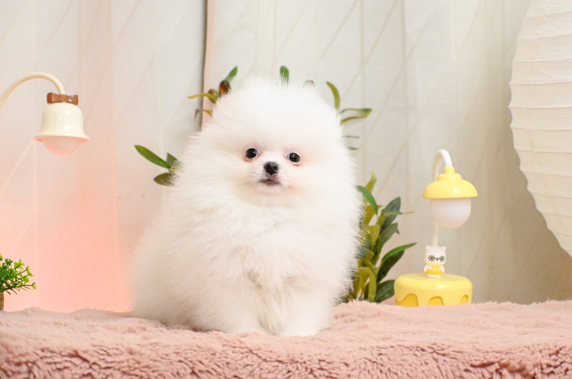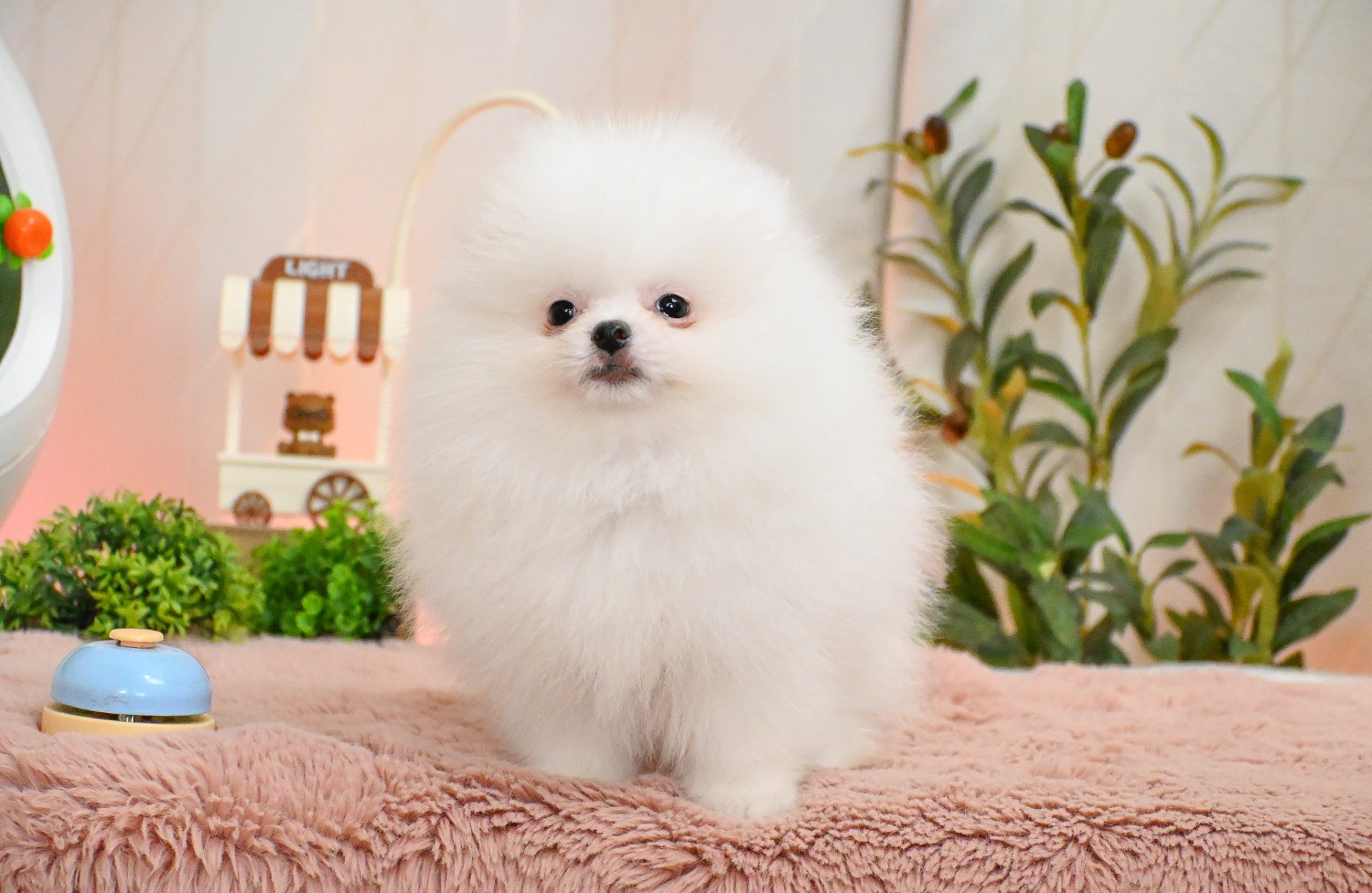 น้องปอมสีขาวตัวผู้ ตัวเล็ก ขนแน่น ตัวสั้น