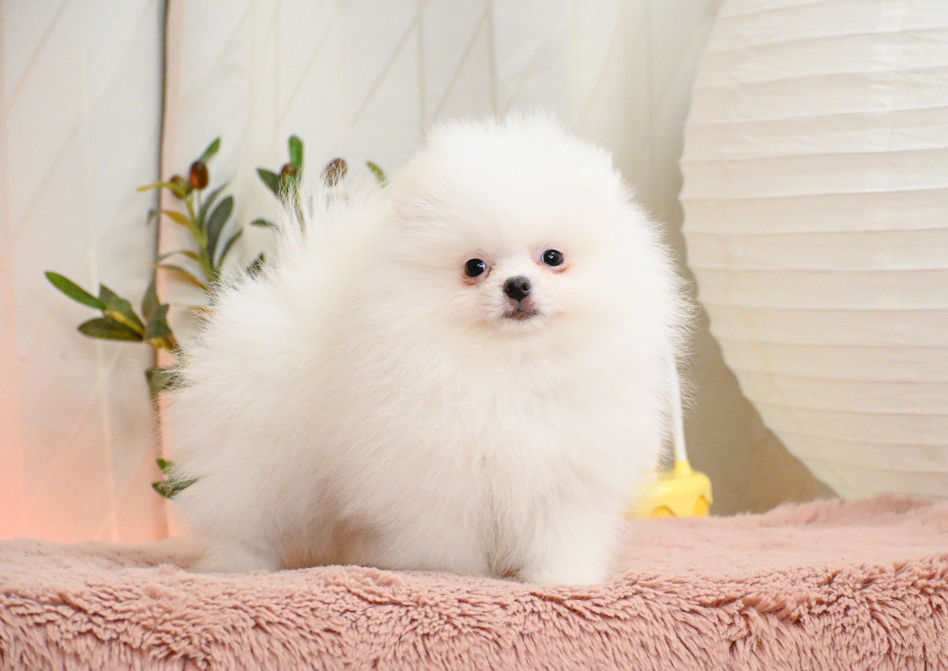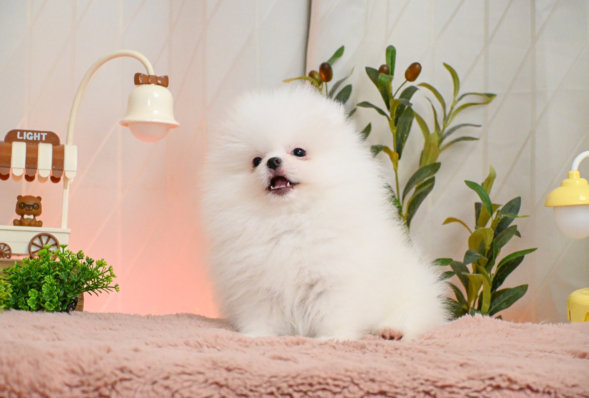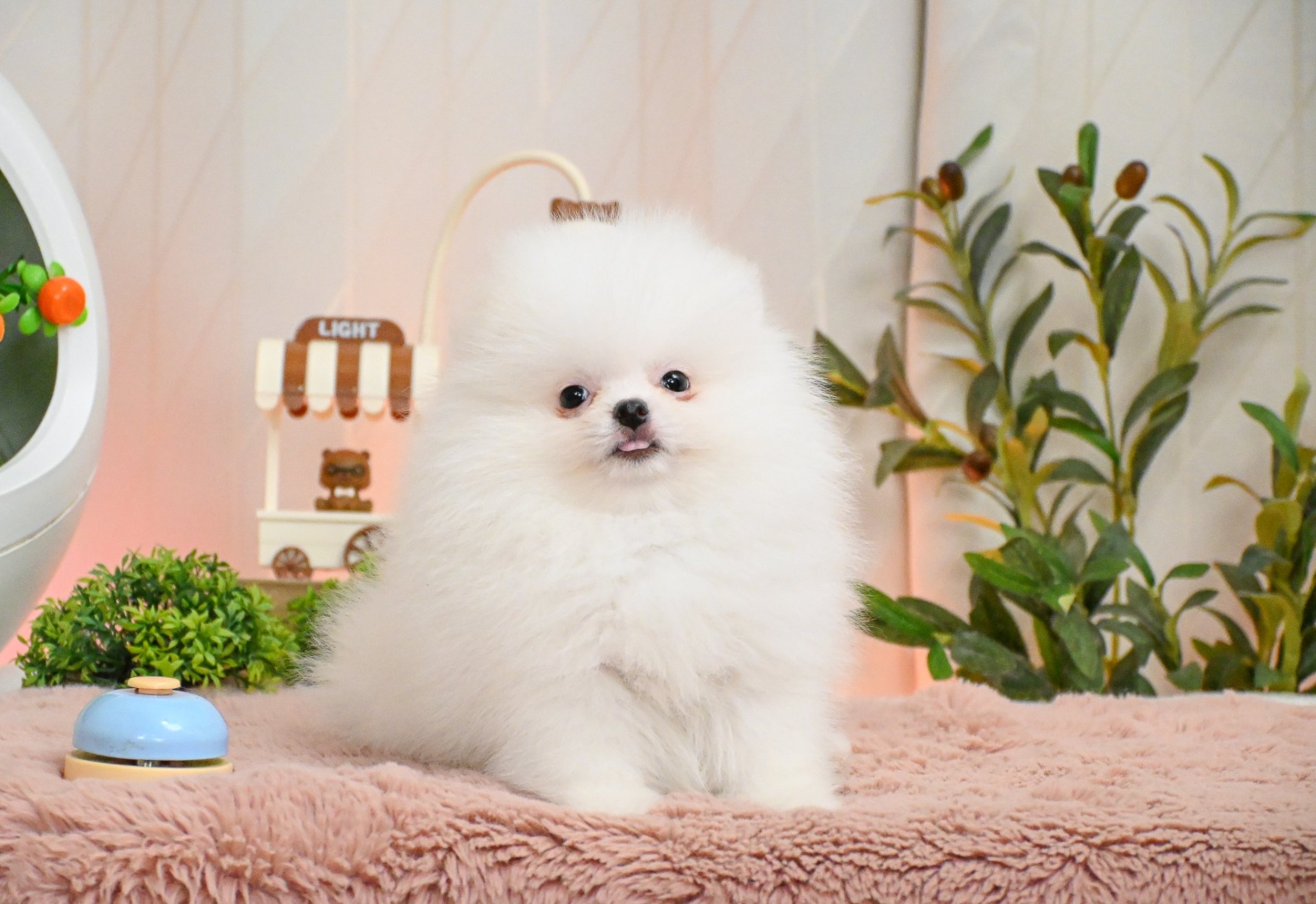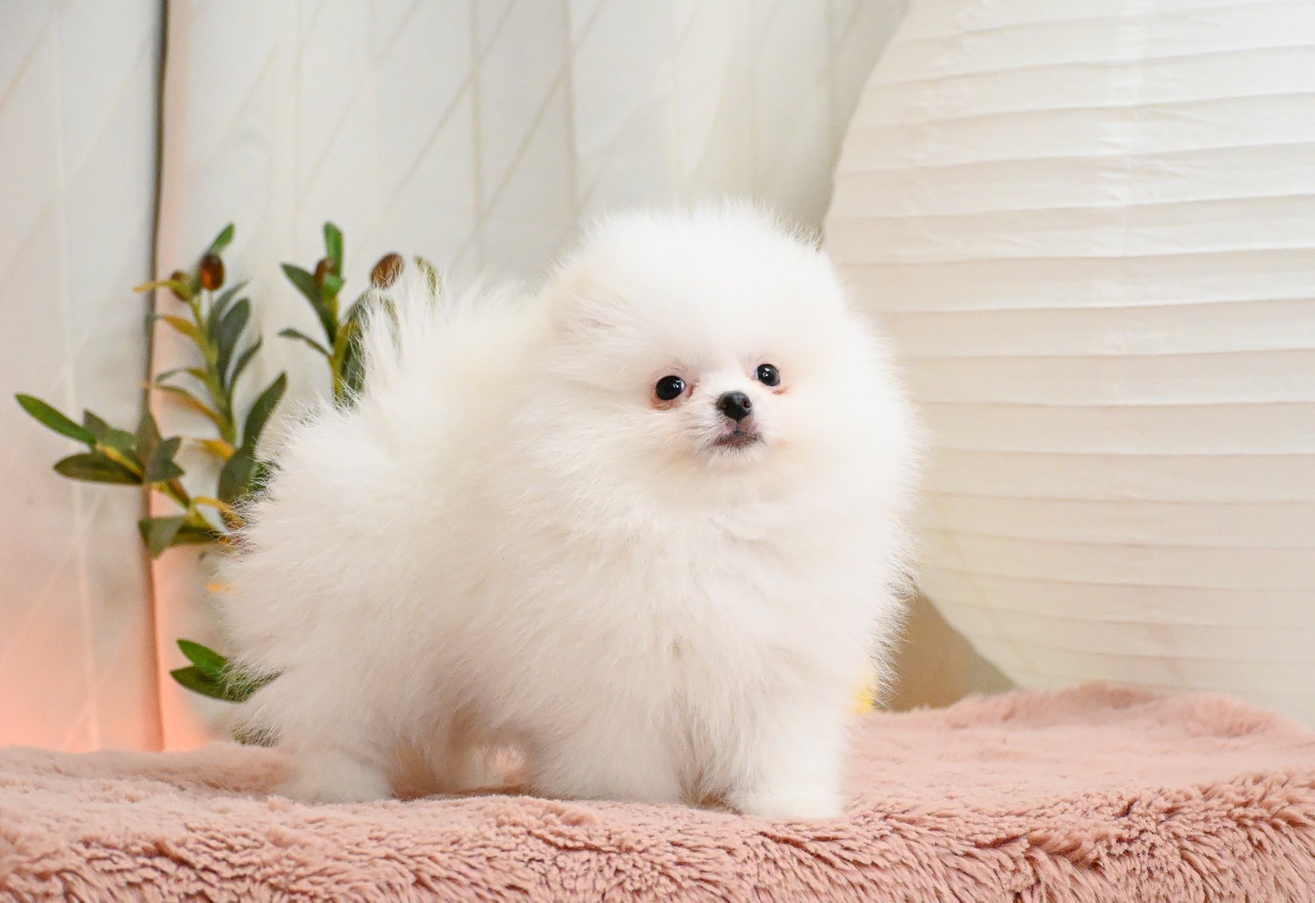 น้องปอมสีขาวตัวผู้ ตัวเล็ก ขนแน่น ตัวสั้น